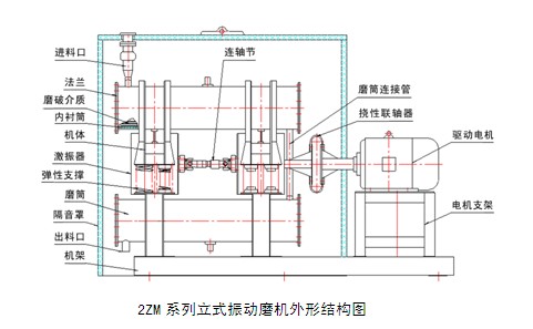 本機(jī)主要由底架、機(jī)體支架、隔音罩、機(jī)體、磨筒、激振器、襯板、彈性支撐、磨破介質(zhì)和驅(qū)動(dòng)電機(jī)等幾部分組成。